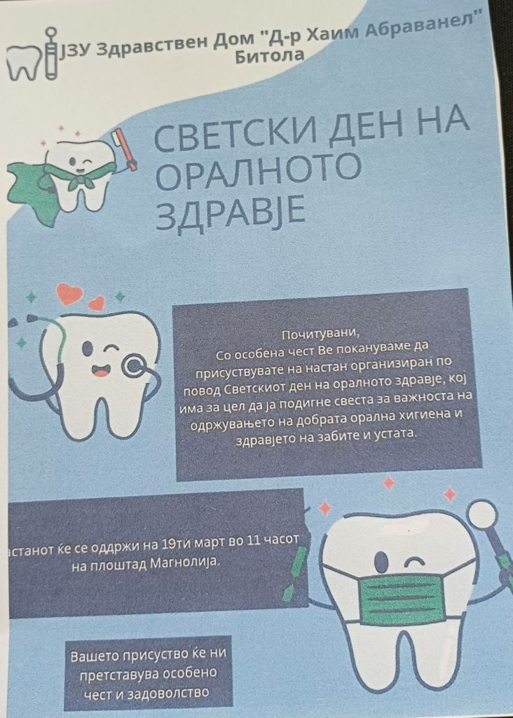 Почитувани, со особена чест ве покануваме да присуствуват на настанот организиран по повод Светскиот ден на оралното здравје, кој има за цел да ја подигне свеста за важноста на одржувањето на добрата орална хигиена и здравјето на забите во устата.